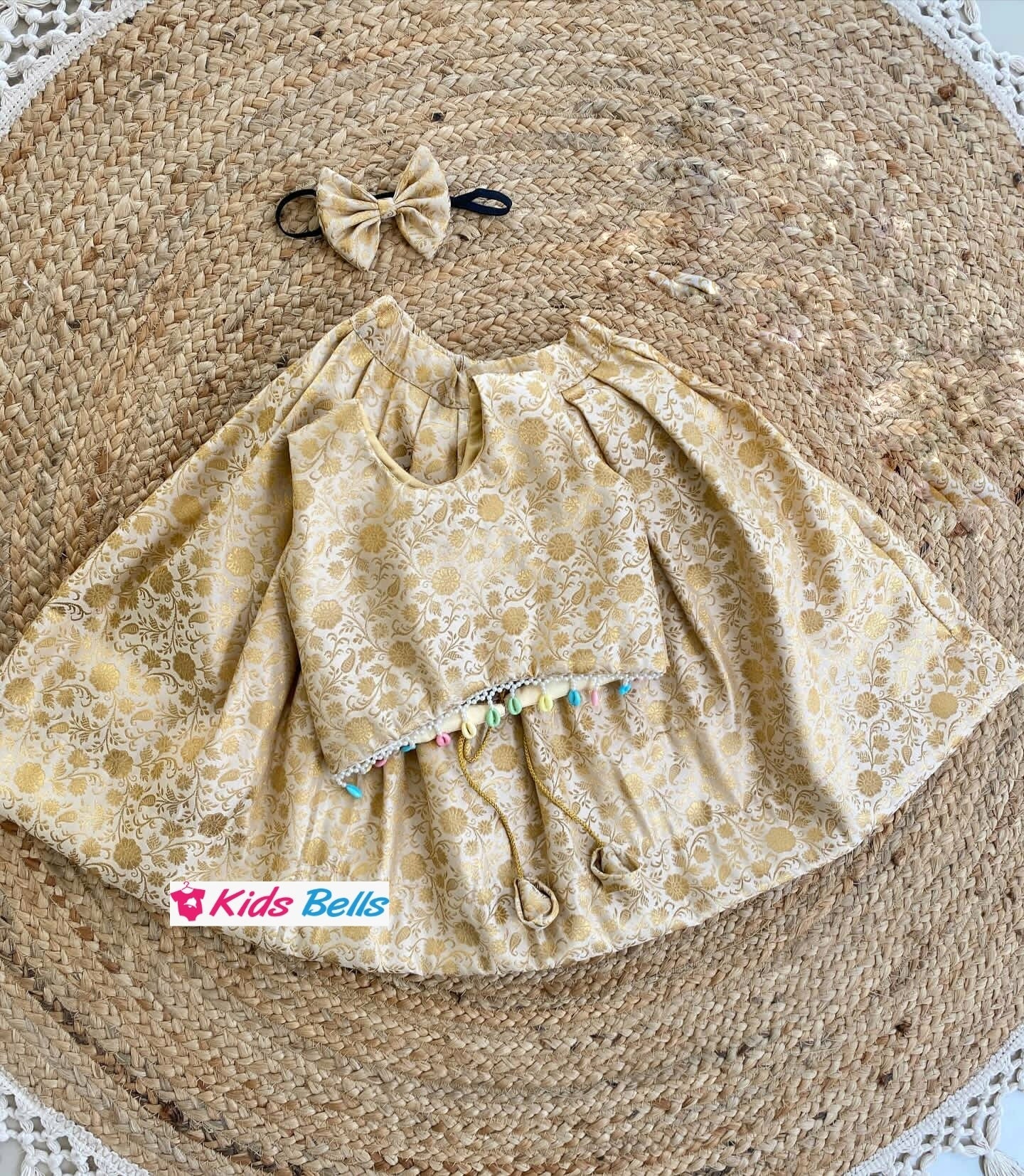 • Girls’ Ethnic Golden Brocade Frock with Hair Accessory