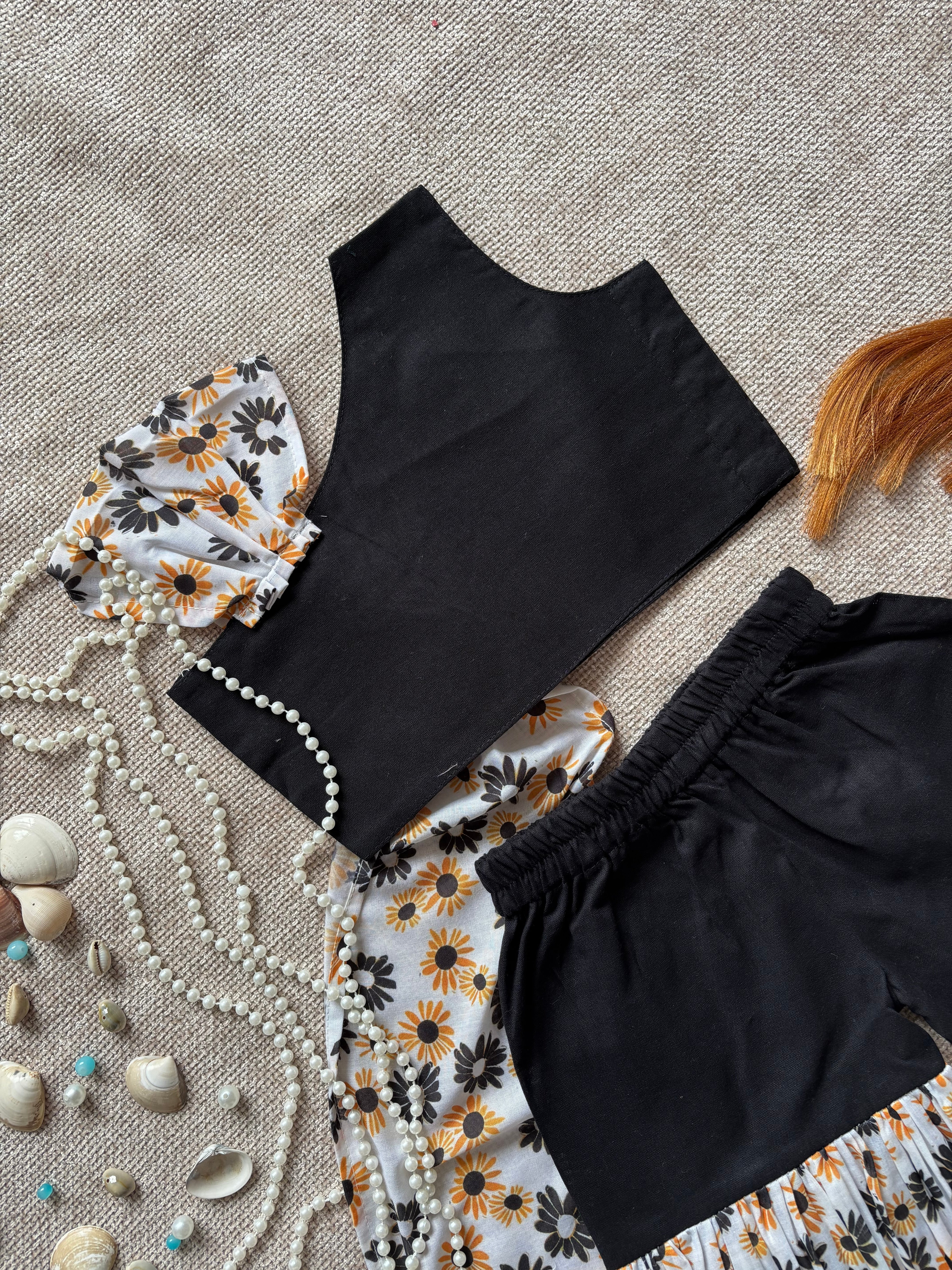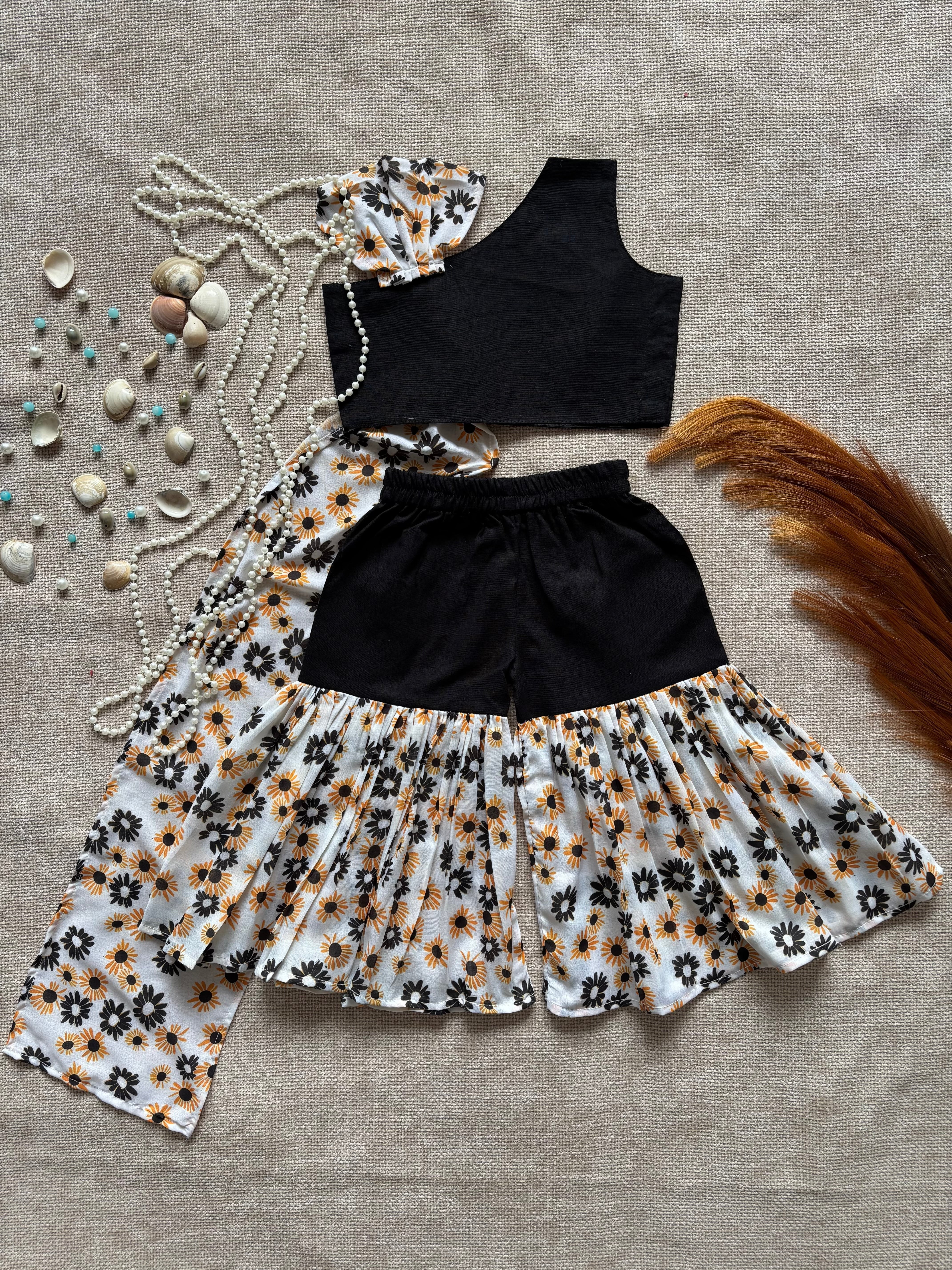 • Sharara: White floral printed Sharara with orange and black flower design, front belt & back elastic for comfort