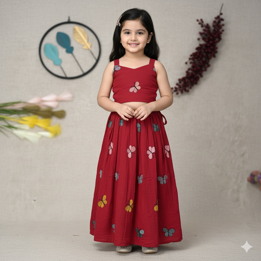 Bring a playful yet elegant vibe to your little one’s wardrobe with this vibrant red 2-piece set. It features a sleeveless crop top paired with a beautifully pleated skirt, both adorned with delicate multicolor butterfly embroidery. The adjustable tie-up waist ensures a comfortable fit, while the soft cotton fabric keeps your child at ease all day. Perfect for birthdays, festive occasions, and special outings, this outfit is a must-have for a chic and joyful look.